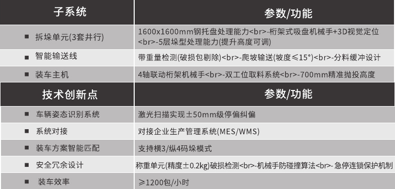 實現(xiàn)袋裝物料拆垛→輸送→稱重檢測→分揀→智能碼垛的無人化作業(yè)處理能力覆蓋20-50kg袋裝化肥,支持32種規(guī)格料包(尺寸誤差±5%)兼容高欄貨車(最大11m×2.5m×3.6m)全自動裝車